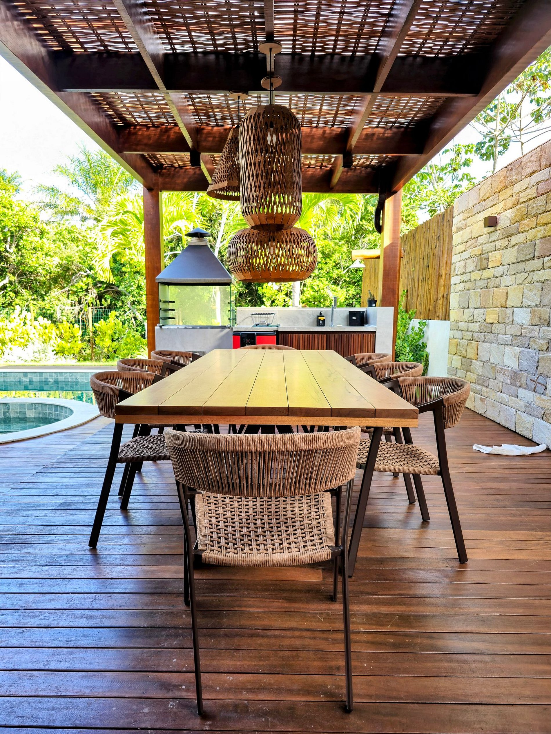 El espacio exterior es una invitación al relax y a la diversión. Disfrute de una refrescante piscina con jacuzzi, ideal para relajarse después de un día de sol. La zona de ocio integrada en la casa cuenta con un completo espacio gourmet, equipado con barbacoa y un bonito sofá que invita a relajarse y socializar con amigos y familiares. La cocina, integrada al salón, proporciona un ambiente acogedor y funcional, perfecto para preparar deliciosas comidas.